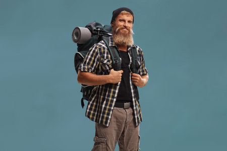Smiling bearded hiker with a backpack posing isolated on blue background