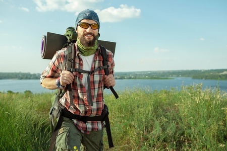 Young smilimg caucasian tourist with backpack walking on the top of hill and looking at the camera