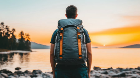 As the sun sets over the tranquil lake, a hiker stands quietly, gazing at the vibrant sky. Their backpack, adorned with colorful patches, symbolizes adventurous journeys.