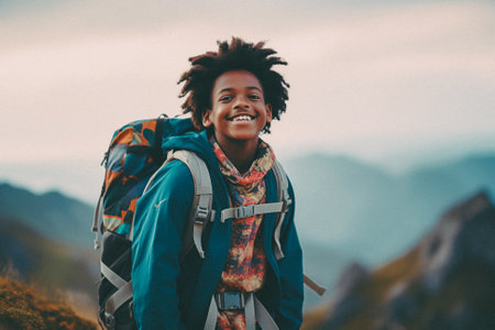 Smiling african american woman hiker with backpack hiking in mountains.