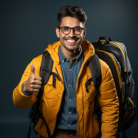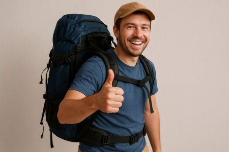 Happy hiker wearing cap and backpack showing thumbs up gesture, expressing positivity and excitement for upcoming journey