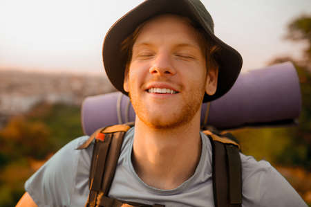 Young smilimg caucasian tourist with backpack standing on the top of hill. The concept of an invitation to travel