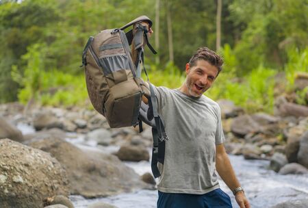 outdoors lifestyle portrait of young happy and attractive man with travel backpack hiking in river at forest feeling free enjoying nature and fresh environment on summer trekking journey