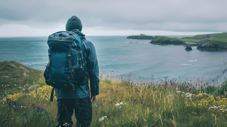 man with his back turned, showing his backpack and the coastal landscape in front of him. generative ai