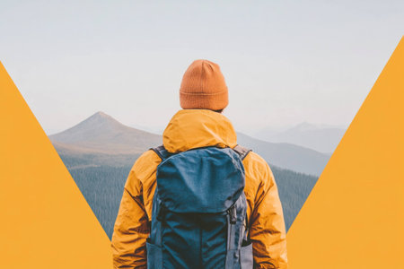 Young man in a bright yellow jacket and orange beanie exploring the mountains, embodying adventure and wanderlust, with a stunning natural landscape