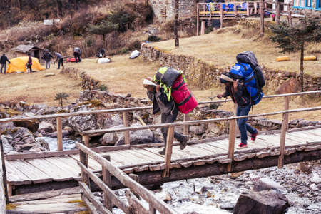 Porters of Himalaya Mountain expedition crossing wooden bridge