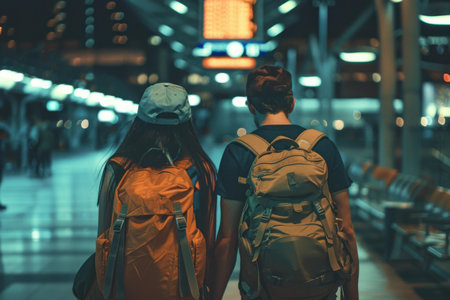 A couple with backpacks travels the world. The guy and the girl delight and raise their hands aloud. Lovers wait for their train and enjoy the view