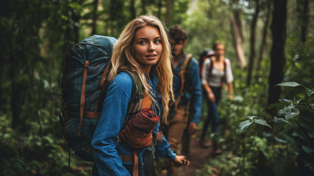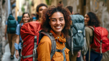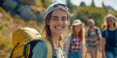 Smiling woman hiker with backpack looking at camera with group of friends hikers background, World Tourism Day - Ai Generated
