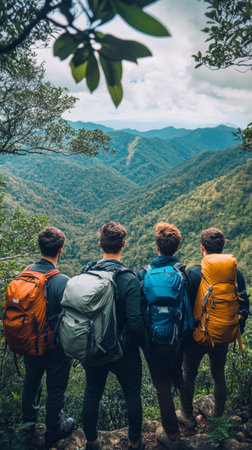 Five friends stand together at a high vantage point, gazing at the lush green mountainscape. Their backpacks hint at a day filled with exploration and camaraderie in the wilderness.