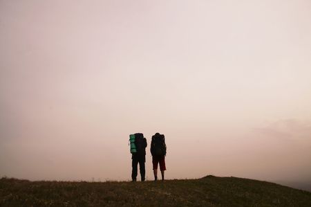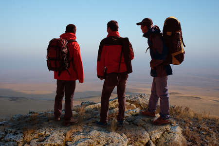 Rear view of Hikers with backpacks enjoying beautiful landscape on the mountains.
