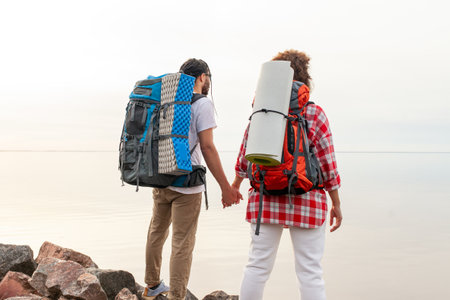 young african american couple with hiking backpacks and equipment standing against sea and sky and holding hands, curly woman and man tourists traveling looking away at horizon on isolated background, rear view