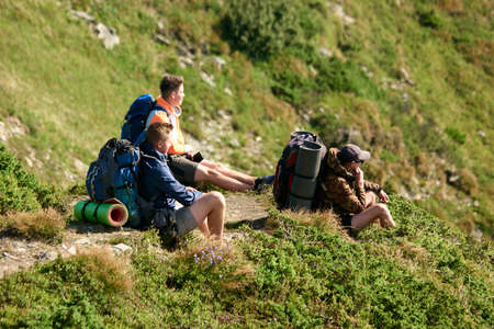 Young tourists sitting on grassy hill in mountains. Three young man tourists enjoying the nature in Carpathian Mountains, Ukraine. People, trekking, outdoor activity and tourism concept.