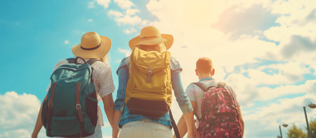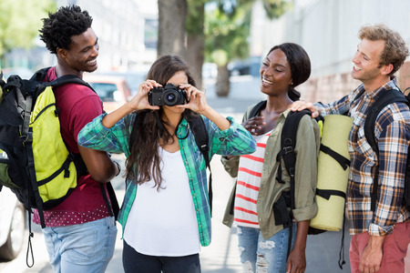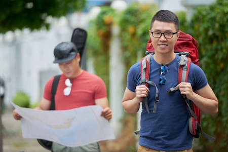 Smiling young tourists carrying backpacks are enjoying their vacation