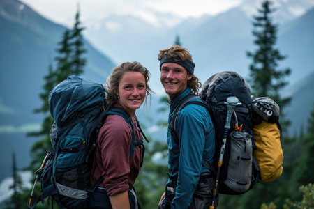 Couple Hiking with Backpacks and Scenic Mountain Views, Adventure Travel and Outdoor Lifestyle