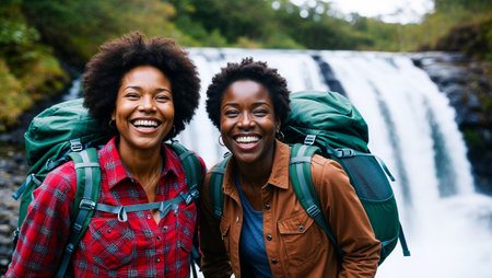 Two happy female hikers are smiling in front of a beautiful waterfall during their adventure in nature. AI generated image