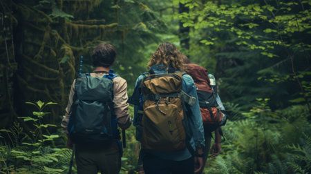 Group of friends with backpacks hiking in the forest. Hiking concept