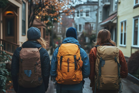Three hikers are walking down a residential street with backpacks, exploring a new city