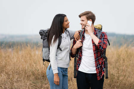Smiling tourist touching backpack near african american woman on blurred background on hill