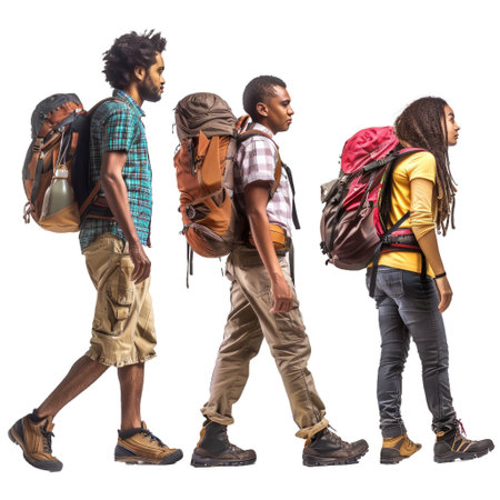 Diverse group of four hikers with backpacks stepping forward in profile view on a transparent background