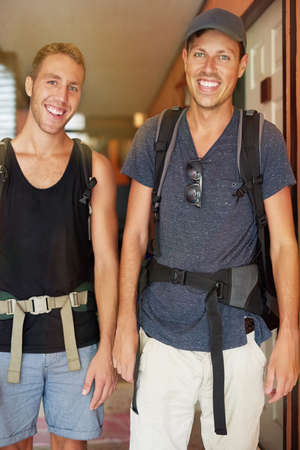 Ready for the road. Portrait of two smiling young friends wearing backpacks traveling together in Thailand.