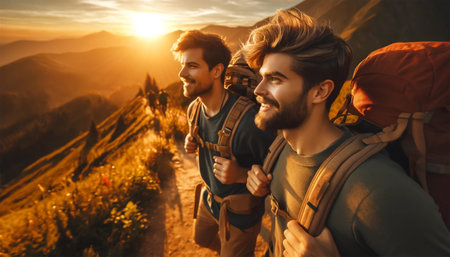Close-up view of two close friends walking along a mountain path at sunset. They are dressed in comfortable hiking clothes and backpacks. The warm golden light of the setting sun illuminates their faces, revealing a combination of determination, joy and the beauty of the nature around them.