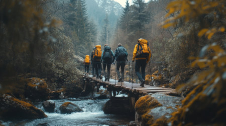 A group of hikers with backpacks walks across a wooden bridge surrounded by lush trees and a flowing river. The atmosphere is tranquil and misty, showcasing the beauty of nature.
