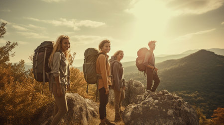 Four hikers with backpacks take a selfie while walking across the mountains. GENERATE AI