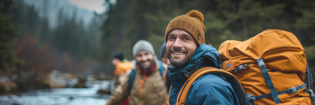 Team of friends trekking or hiking with backpacks. Happy man looks back at the photo camera while walking together with a group of people about a hilly rural area. Tourism, active lifestyle concept