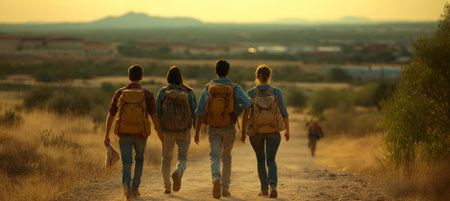 Friends Hiking on a Scenic Trail at Sunset, Embracing Adventure and Exploration Together