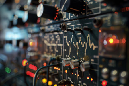 Close up of a control panel with illuminated buttons, switches, and knobs, displaying a signal graph on a screen