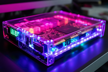 A computer case with neon lights on it. The case is made of clear plastic and has a purple and pink color scheme