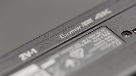 Kuala Lumpur, Malaysia - June 3,2021 : Sony compact or mirrorless camera closeup on black background. Selective focus and crop fragment