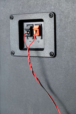 Red and black twisted wire connected to cable connection socket on rear side speaker system box side view vertical photo closeup
