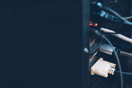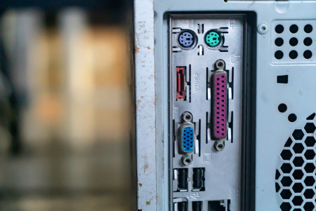 Close-up view of a computer back panel showing various ports and connectors such as VGA, USB, and HDMI. Ideal for technology and electronics themes.