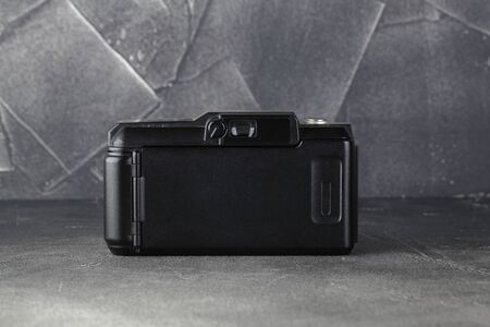 The old Japan 35 mm compact film camera Olympus Wiev Zoom 120 with 38-120 mm glass lens, released 2001 on gray cement background.