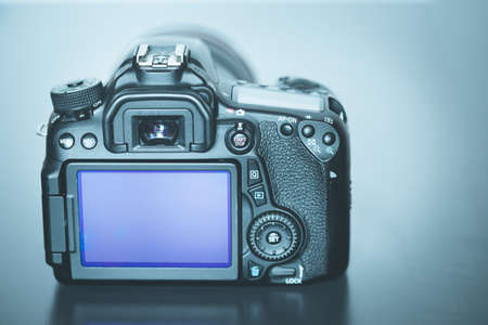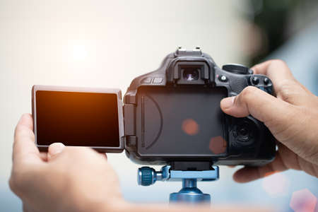 Professional photographing: Back view of a professional reflex camera, flip screen