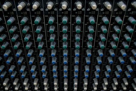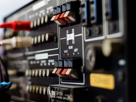 Close-up side view of a panel of buttons and twirls located on a panel of military secret equipment at a military base. Strategic production concept