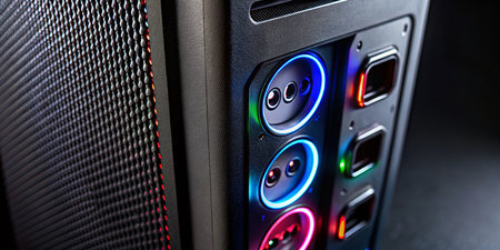 Sleek Black Gaming PC Top Panel: USB Ports, Power & Reset Buttons Close-Up Stock Photo