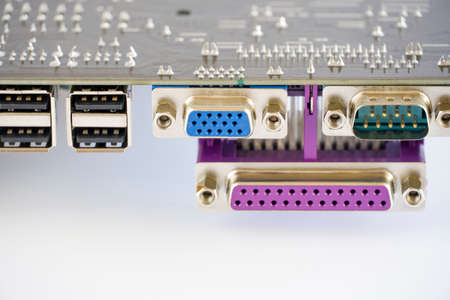 connectors USB on computer motherboard background, board socket and input and output ports close-up