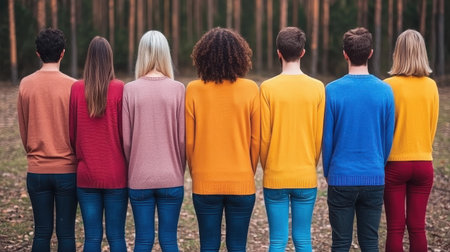 A group of friends stands together in colorful sweaters against a beautiful forest backdrop, highlighting warmth and togetherness.