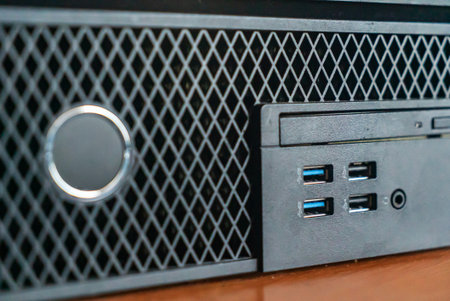 A close-up view of the USB ports on a computer panel. This image features modern technology, perfect for illustrating connectivity and electronic hardware.