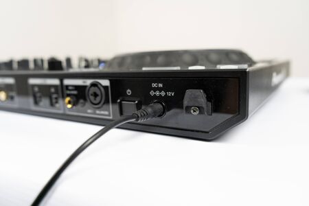Cable to connect professional DJ midi controller to audio mixer.Concert equipment for home party.Disc jockey technology to mix digital music tracks.RCA audio cables