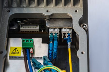 Fiber Optic cables connected to an optic ports and UTP Network cables connected to ports.