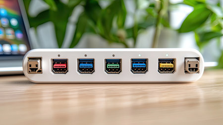 A sleek USB hub featuring multiple ports offers versatile connectivity for devices. Set against a vibrant nature backdrop, it enhances workspace aesthetics.