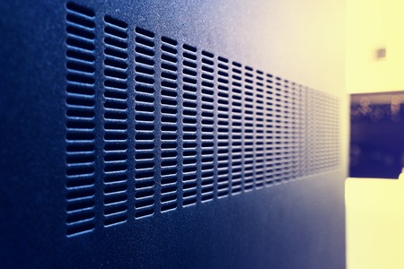 Detail of a rear portion of a LED LCD wall or stage panel. Display system for concerts, with visible rear panel with power and signal connectors visible.