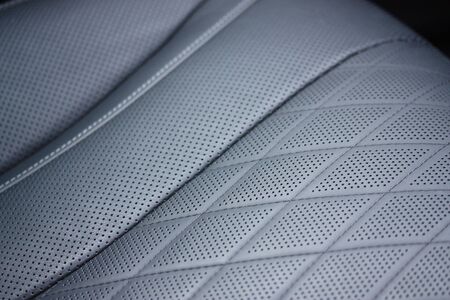 Modern luxury car black leather with alcantara interior. Part of black leather car seat details with white stitching. Interior of prestige car. Perforated leather seats isolated. Perforated leather.