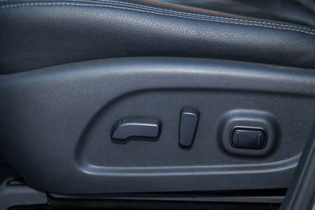 Close-up Interior view with electric seat adjustment, buttons of luxury very expensive new black car stands after cleaning and detailing in the vehicle repair workshop. Auto service industry