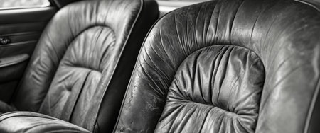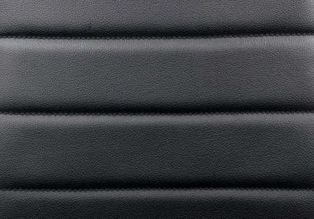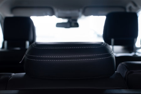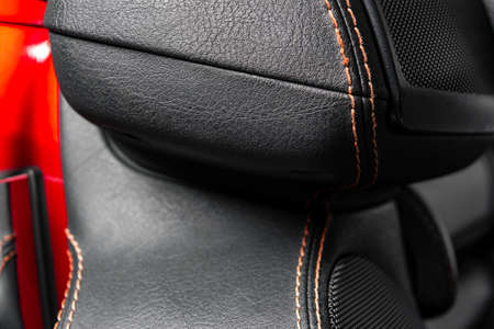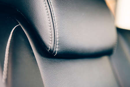 Detail of a stitch of an elegant car headrest upholstered in black handmade leather