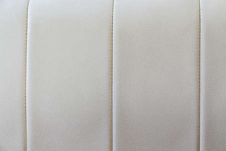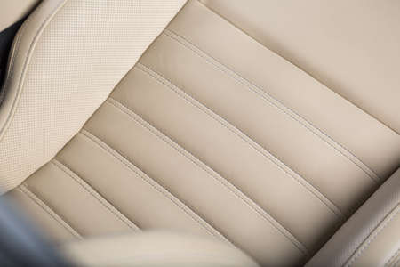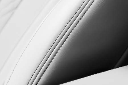 White leather interior of the luxury modern car. Perforated white leather comfortable seats with stitching. Modern car interior details. Car detailing. Car inside