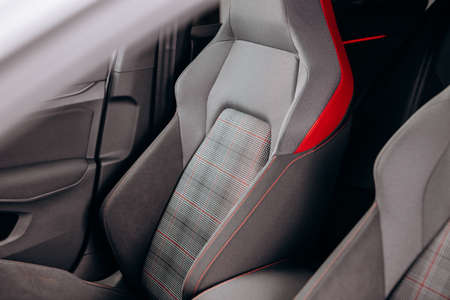 Modern luxury car black leather interior. Part of leather car seat details with red stitching. Interior of prestige modern car. Comfortable perforated leather seats. Black perforated leather. Car detailing